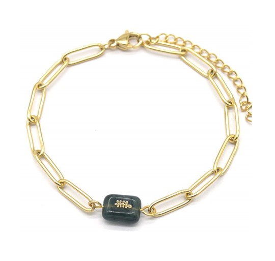 Mooie armband met een donker groene steen met daarop een veertje.
