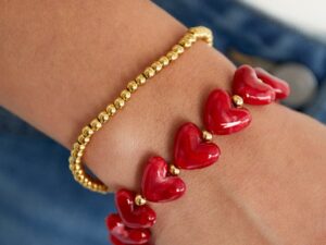 Leuk stiek armband met bruine acryl hartjes en stainless steel kraaltjes.